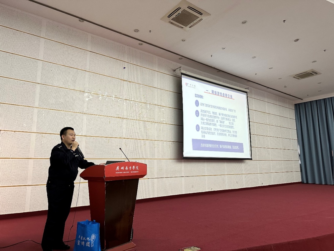 岳林警官首先总结了2022年驻从化区高校诈骗案件发生情况,向在参加宣讲会的各位师生讲解了大学生群体易发、高发三种诈骗套路,即:冒充客服类诈骗、游戏买卖类诈骗及刷单奖励类诈骗,详细列举了相关诈骗常用的“话术”,并向师生强调一旦上当,切记“沉没成本效应”,一定要及时止损,立即报案。对于学校不高发,但危害性更大的以感情、投资理财为手段的“杀猪盘”式诈骗,岳林警官也以案例的方式进行了讲解。