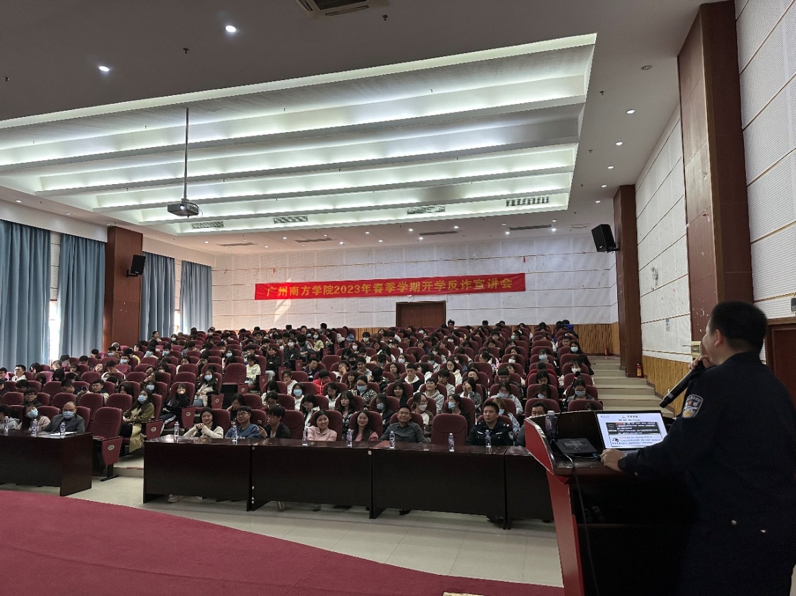 为进一步深入贯彻习近平总书记关于打击治理电信网络诈骗犯罪工作重要指示精神,提高师生反诈防骗意识,筑牢安全防线,3月1日,我校于图书馆学术报告厅举行了2023年春季学期开学反诈防骗宣讲会,助力平安校园建设。广州市公安局从化分局温泉派出所副所长张华荣、广州市公安局从化分局指挥中心岳林警官应邀到会,并向参加宣讲会的200余名校园反诈志愿宣讲员师生详细总结了近期高发的电信网络诈骗案例以及对应的防范策略。学校保卫处全体成员旁听学习了本次宣讲,并向公安干警致以热烈的欢迎和衷心的感谢。