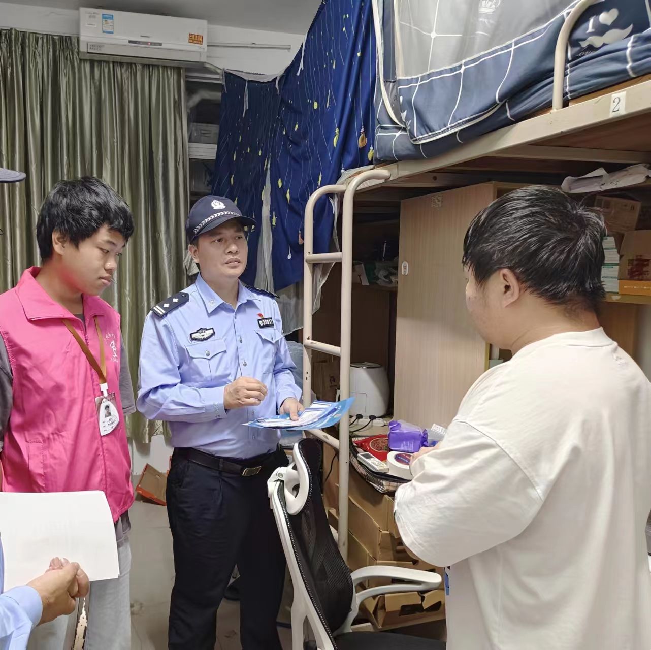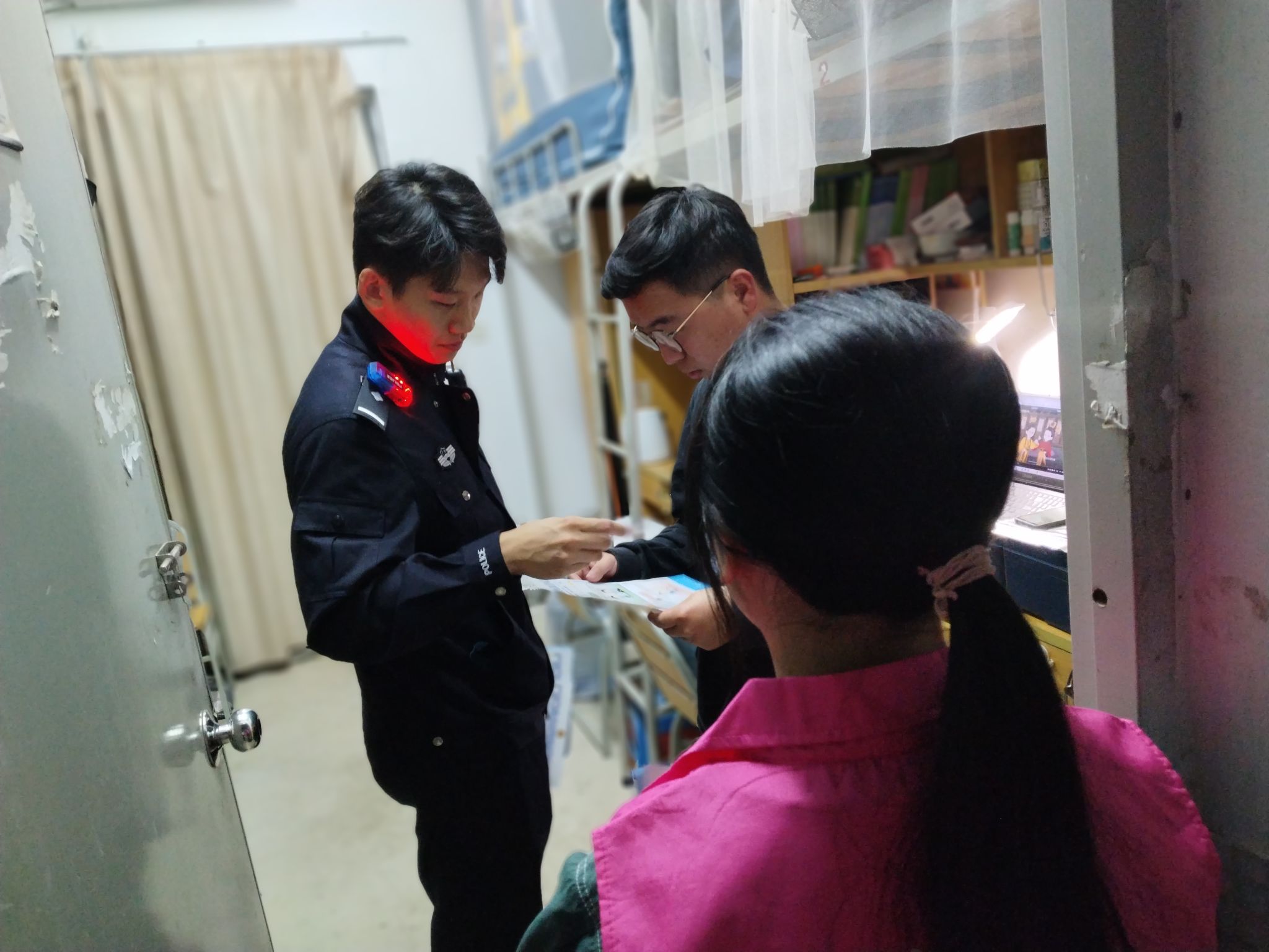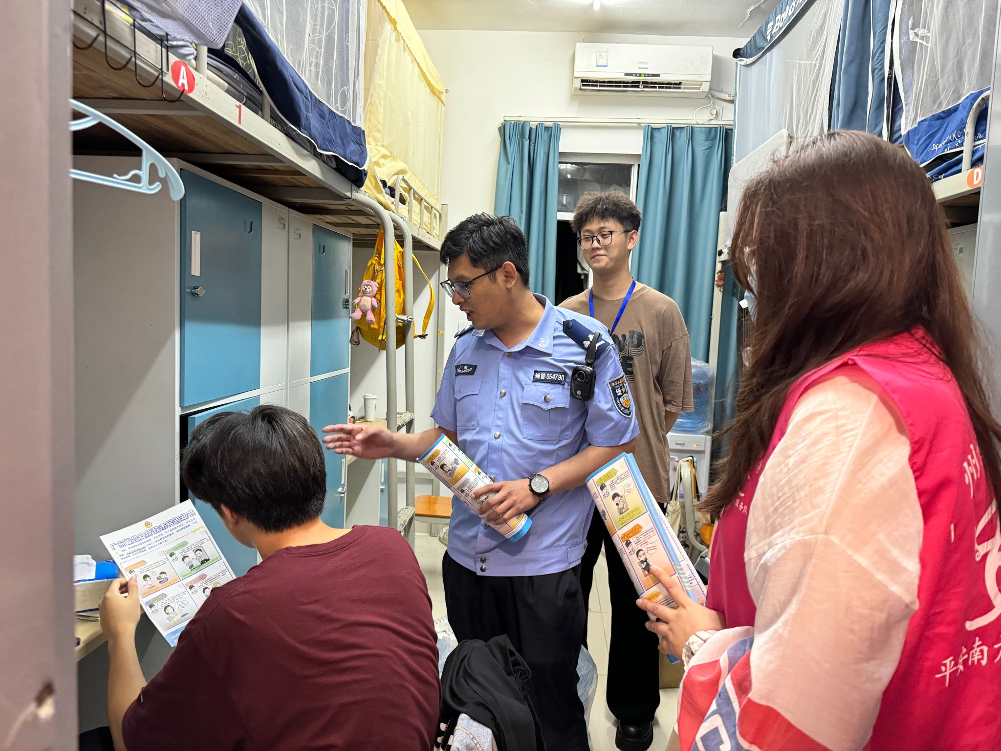 起初,面对陌生同学,我有些拘谨,但当开始讲解反诈防骗知识时,同学们专注的神情和积极的回应让我放松下来。有的同学会提出自己遇到的疑似诈骗情况,我们一起分析;有的同学认真阅读传单,还会询问更多案例。从一楼到顶楼,一间间寝室走过,虽然疲惫,但内心满是充实。